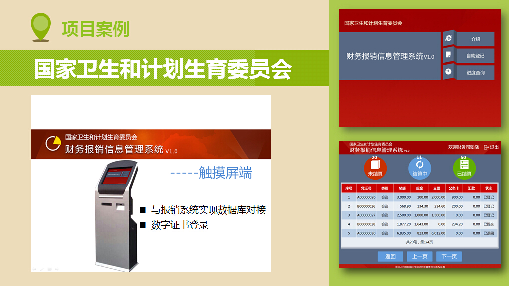 ? ? ? 天创科林触摸屏财务报销信息管理系统是天创科林公司针对财务信息报销流程复杂、报销过程繁琐、报销时间长、财务人员业务繁重、查询困难等问题专业研发的。融合了目前新的互联网技术、信息交互技术、物联网技术等,采用图片、文字、音视频等表现元素的触摸屏体机及其相关软件系统,实现财务报销信息智能化管理,实现财务管理信息查询、进度流程查询、业务资料数据化管理等功能,减轻了财务管理工作人员负担,提高了业务办理效率,实现了科技化办公。