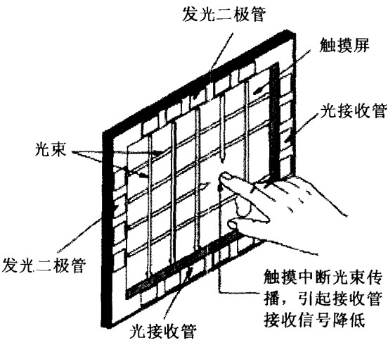 ? 红外多点触摸屏是利用X、Y方向上密布的红外线矩阵来检测并定位人的触摸手势的电子设备。红外触摸屏在显示器的前面安装个电路板外框,电路板在屏幕四边排布红外发射管和红外接收管对应形成横竖交叉的红外线矩阵。手指在触摸屏幕时,就会挡住经过该位置的横竖两条红外线,因而可以判断出触摸点在屏幕的坐标位置。任何非透明物体都可改变触点上的红外线而实现触摸操作。