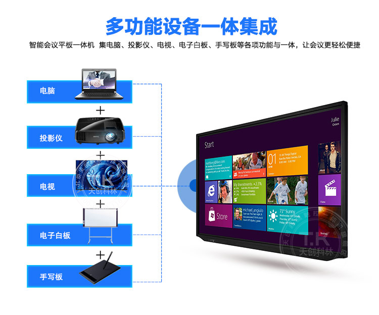 触控教学会议体机的推出,很好地解决了传统电子白板所面临的系列问题。比如像,传统电子白板搭配投影使用时,老师讲课所遇到的遮挡光线问题;比如像传统电子白板周边配套设备太多,导致安装时繁琐的布线以及让教室看起来相对不整洁;再比如像传统许多电子白板书写都要使用专用的笔等等。
