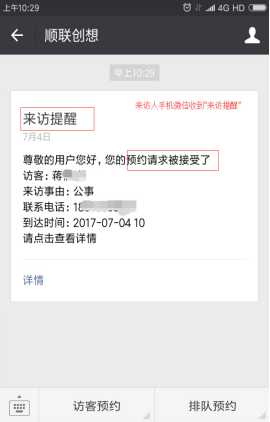 6、被访人确认后,来访人手机上,收到反馈,如同意接待,系统生成二维码