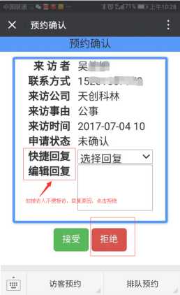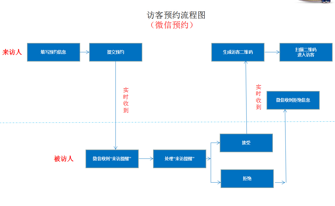 使用悦访客微信预约自助访客系统, 访客只需通过微信登陆公众号,在访客页面上,提交微信预约拜访申请,被访人就能在手机微信上实时收到“来访提醒”的申请,可以根据自己情况,选择拒或者接受,随时处理来访信息。访客申请被通过后,可自行在悦访客微信预约自助访客机上进行人证核验,通过扫描电子二维码访客单,进行扫描登记,同时还能对接人证核验闸机,进行拜访。
