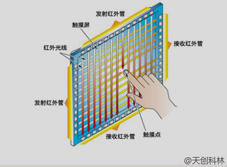 红外触摸技术的工作原理:红外触摸屏使用密集在X和Y方向的红外矩阵来检测和定位用户的触摸。红外触摸屏在显示器的前侧设置有电路板外框,电路板在屏幕的四个侧面上布置红外发射管红外接收管,对应于交叉红外线个接个矩阵。当用户触摸屏幕时,手指阻挡通过该位置的红外线,因此可以判断触摸点在屏幕上的位置。