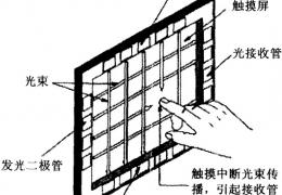 ? 红外多点触摸屏是利用X、Y方向上密布的红外线矩阵来检测并定位人的触摸手势的电子设备。红外触摸屏在显示器的前面安装个电路板外框,电路板在屏幕四边排布红外发射管和红外接