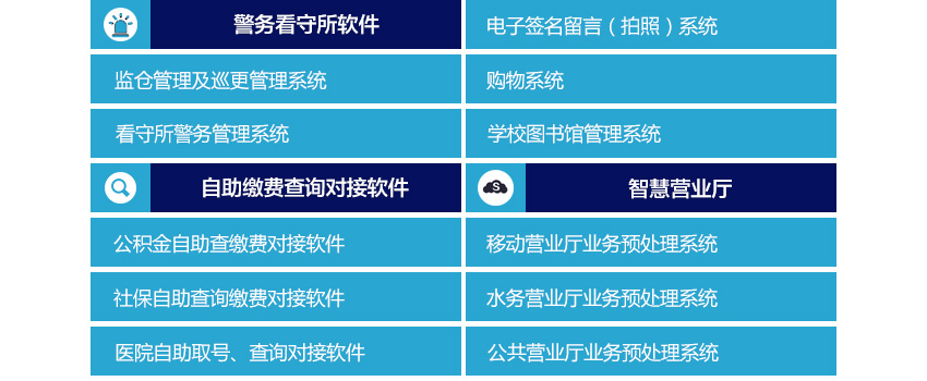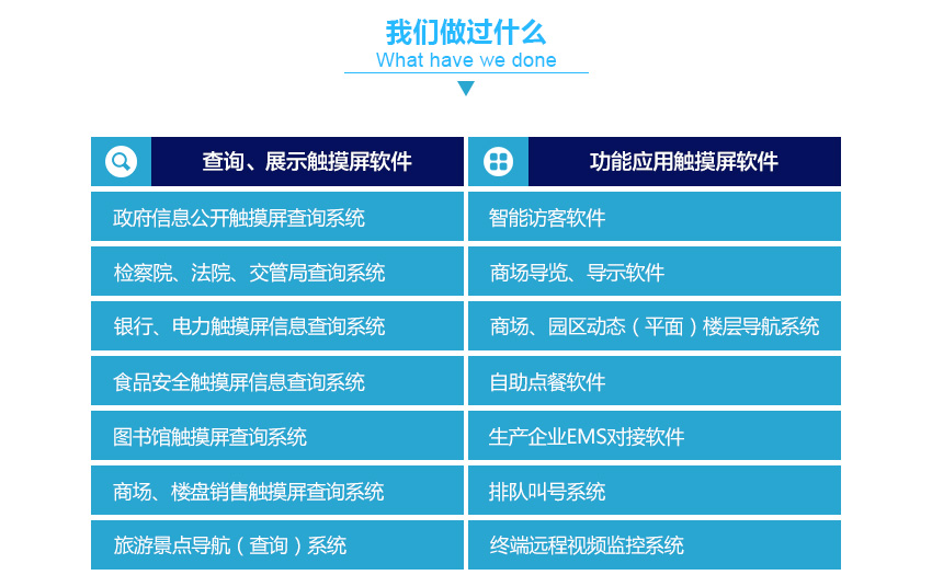 ● 擅长交互程序用户体验设计,软件采用成熟程序框架结构,方便与任何第三方大型平台系统软件数据对接开发,免去第三方对触摸屏终端软件的摸索型开发,节省项目开发工期。